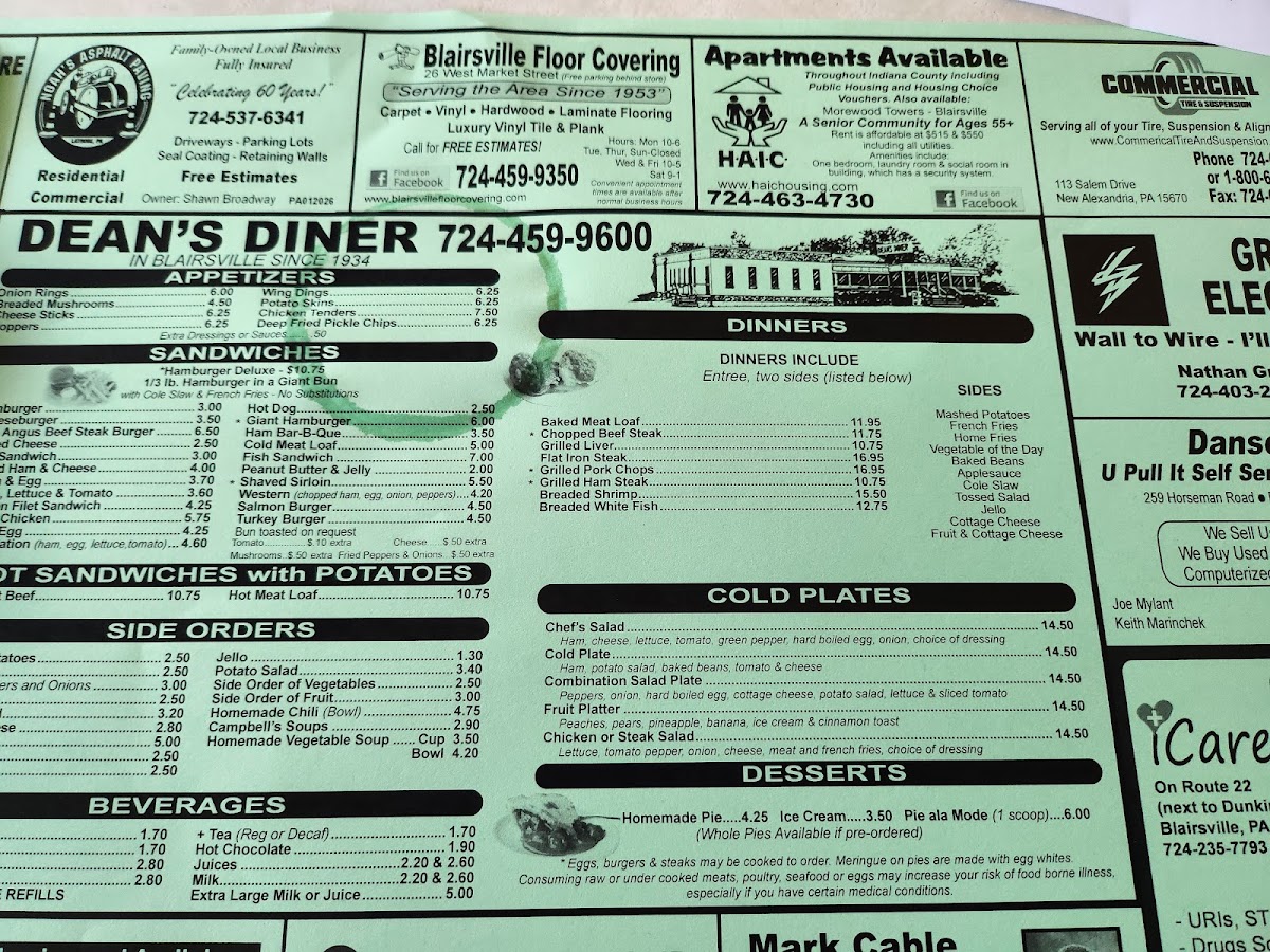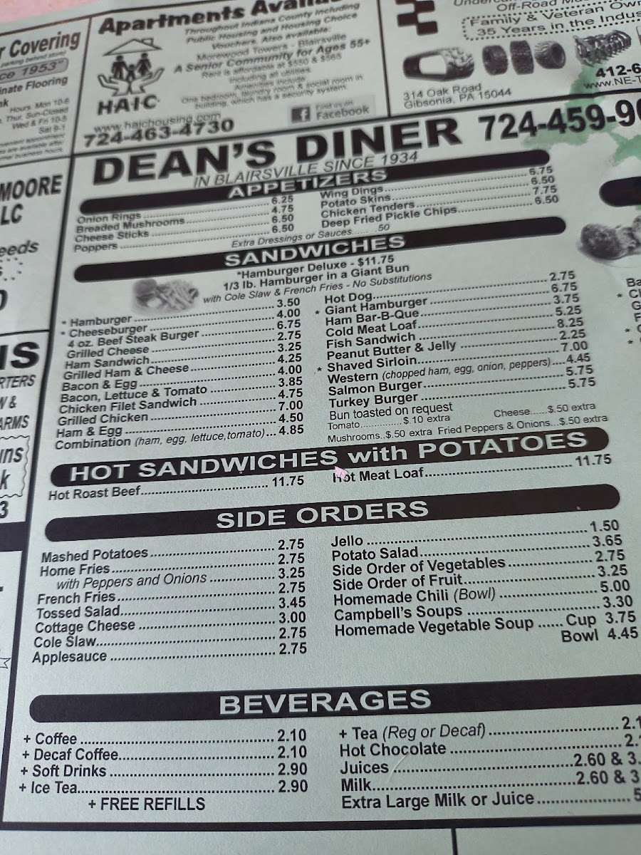 For those looking for something lighter, the Cold Plates, particularly the Chef's Salad or Combination Salad Plate, offer a refreshing escape that doesn’t skimp on flavor. But what truly makes Dean’s Diner legendary is its sweet offerings. Guests rave about the Homemade Pies, with over 20 scrumptious flavors including the delightful Peanut Butter Banana Pie—a treat that one customer described as “to die for.” Whether your sweet tooth is craving something smooth and decadent or a classic slice of fruit pie, you’ll find the perfect dessert to wrap up your meal.